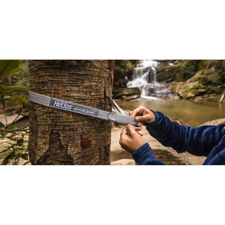 Crafted from super-strong Silverlite™ line with a polyester blend tree sling, the Helios sets up in a flash and provides superior adjustment with a bury splice. Measuring just over 8 feet and able to accommodate even the most awkward of spacing, this techy, tree-friendly strap breaks legendary boundaries for hammockers.