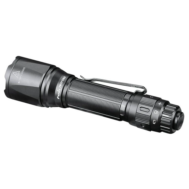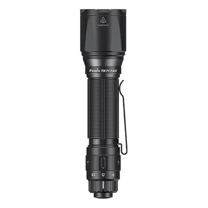 The Fenix® TK11 TAC Flashlight has some new features, including a patented tactical switch and rotary switch. The max output is 1600 lumens, powered by a rechargeable 18650 battery. As a secondary option, two CR123A batteries can also be used to power the flashlight.