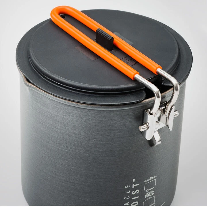 - Pot handle locks in place for cooking, secures set for transport eliminating need for a stuff sack