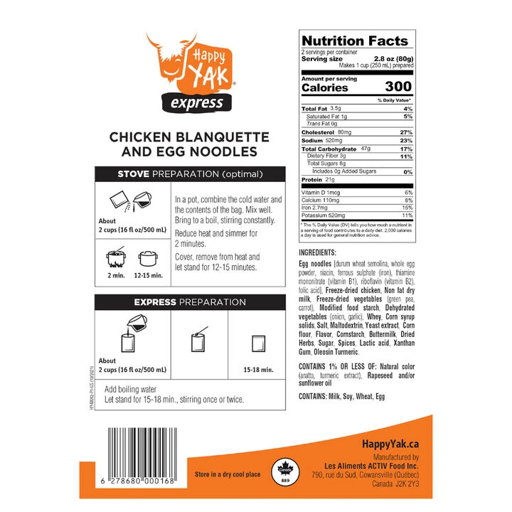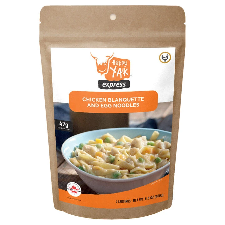 Blanquette, or white savory sauce, coats a generous portion of egg noodles topped with juicy chicken morsels and fresh vegetables. Herbs with a hint of garlic and black peppercorns enrich this elegant classic, while preserving its savory taste.