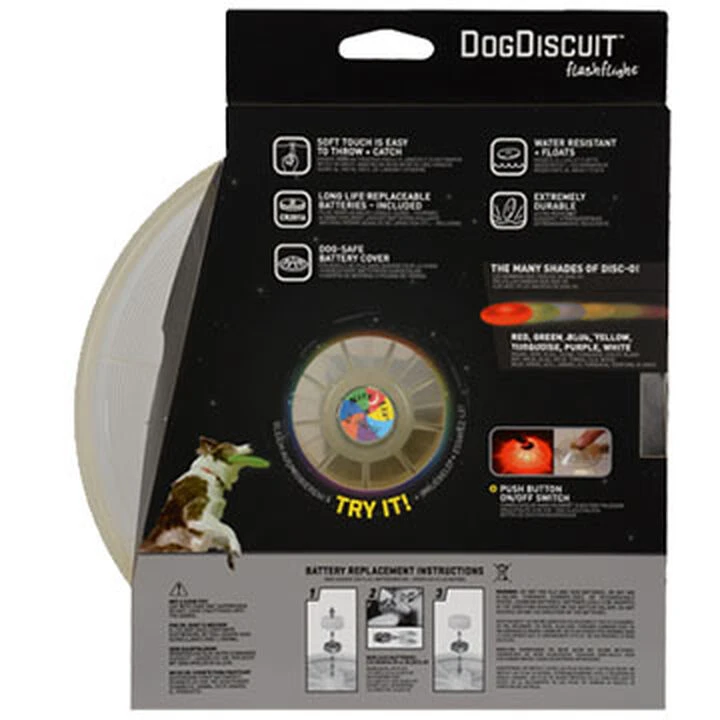 It’s illuminated by a super-efficient, long-lasting LED bulb, so it glows brightly in the dark. The Dog Discuit is not only super fun, it’s mouth friendly, bite durable, and has a canine-resistant cap that helps prevent dogs from chewing off the battery and LED housing.