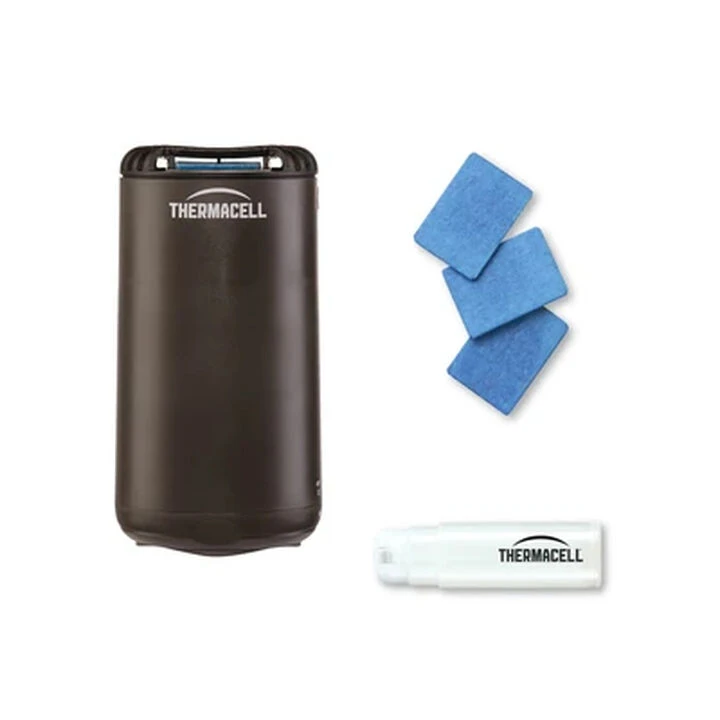 The package contains the Patio Shield Repeller, a cap and 12 hours of refills (three repellent mats lasting four hours each and one fuel cartridge).